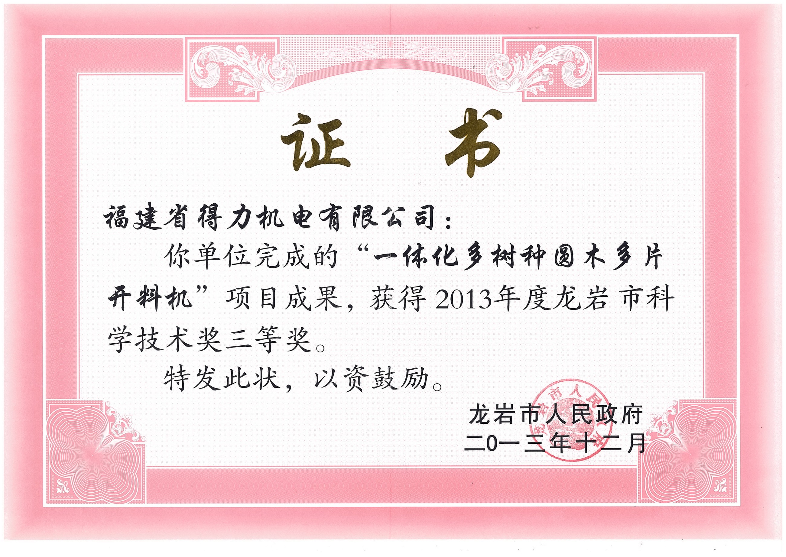 龙岩市科学技术三等奖